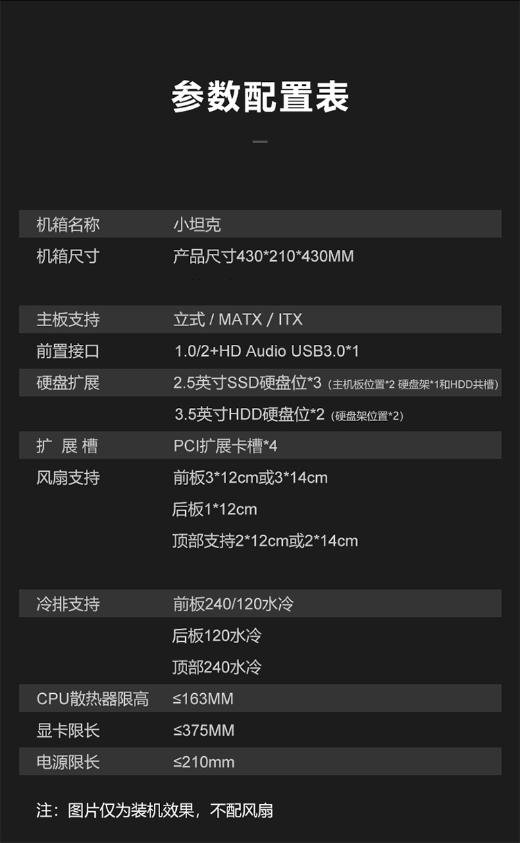 • 散热系统: 风冷(前板3*12cm/3*14cm风扇位、顶板2*12cm/2*14cm风扇位、后板1*12cm风扇位)/ 水冷(前板支持240/120水冷(硬盘架需往后移),顶部支持240水冷,后板支持120水冷,装水冷则无法装风扇)