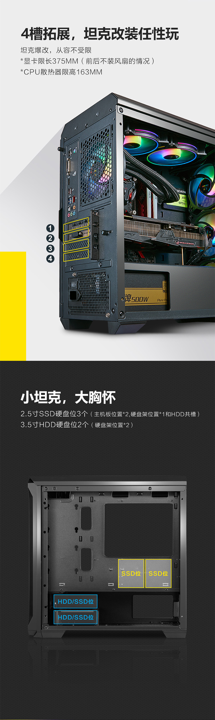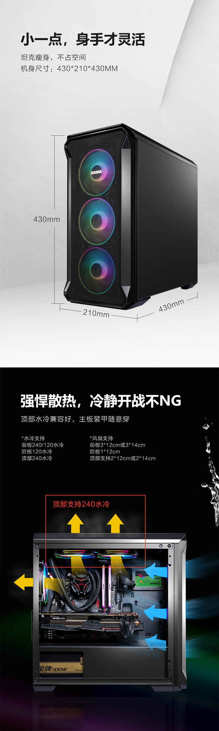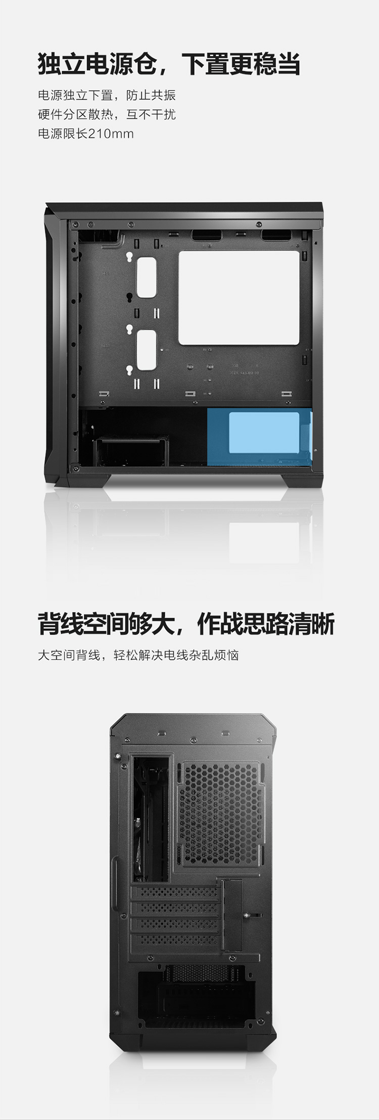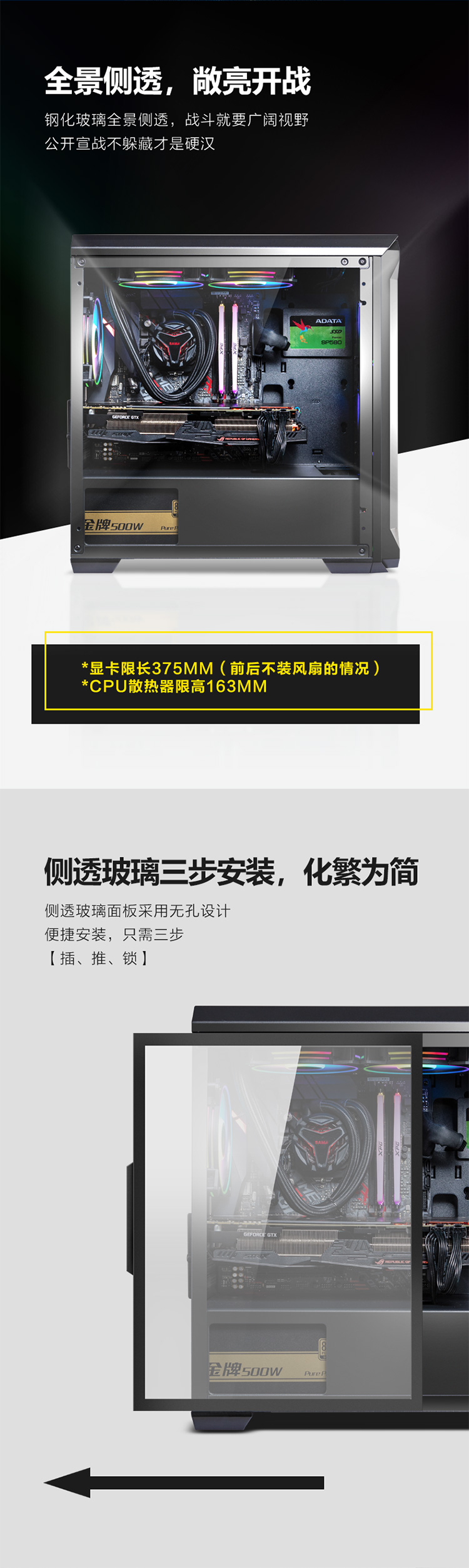 • 限长说明: 支持背线:宽度22mm 、 显卡限长:375mm 、 下置电源:限长210mm