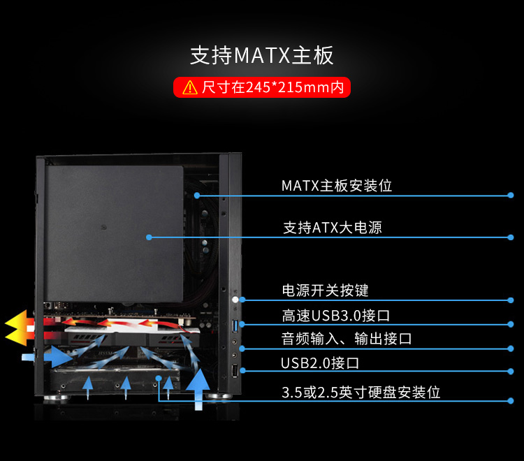 • 特性: 全铝拉丝阳极,小箱体内兼顾ITX和部分MATX主板